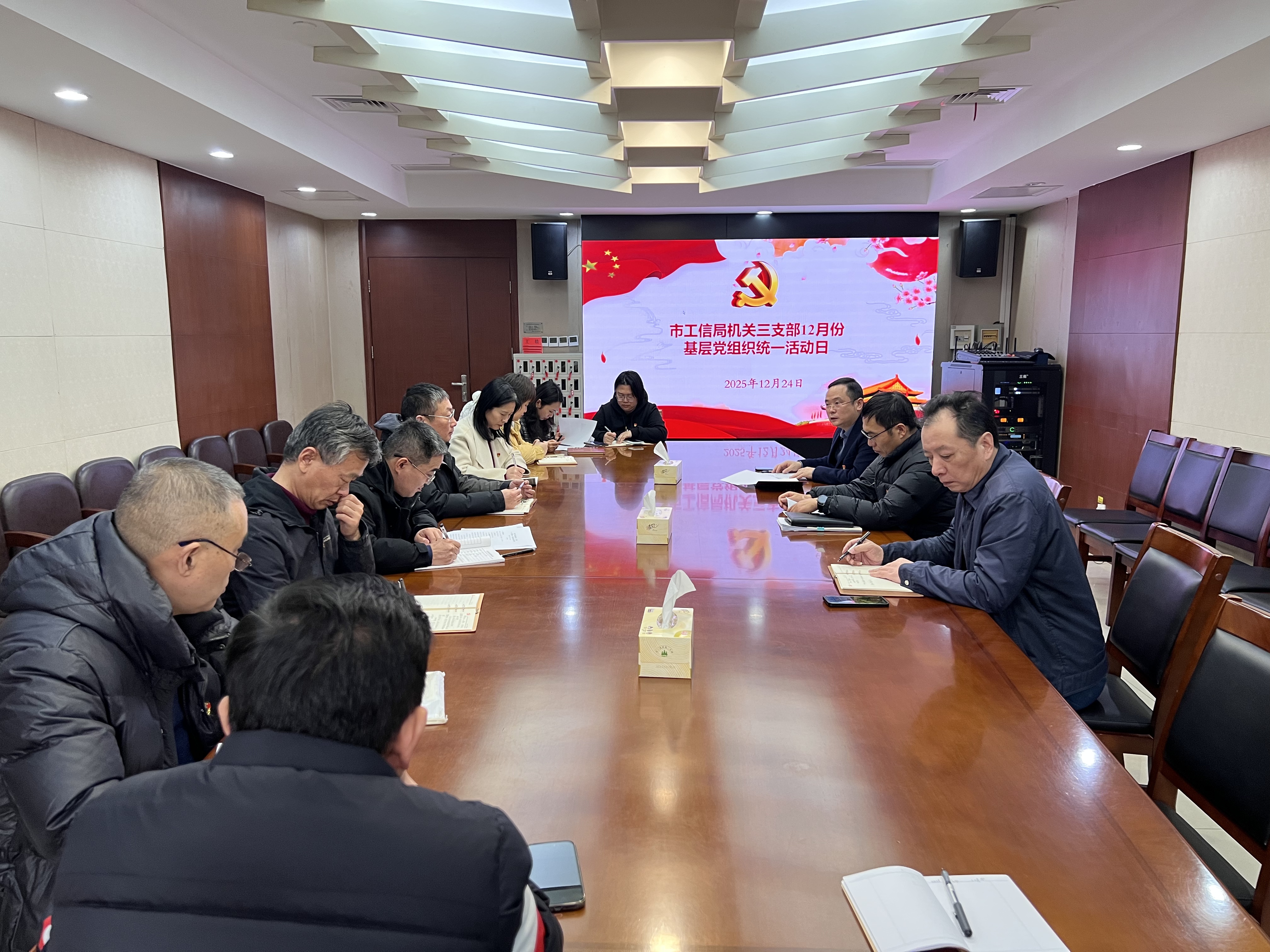 12月24日下午,局机关第三党支部在598会议室开展12月份统一活动日活动。朱镔同志领学习近平总书记在《求是》杂志发表的《扩大内需是战略之举》、中央经济工作会议上的重要讲话精神,中国共产党江苏省第十四届委员会第十次全体会议精神,省委书记信长星同志关于《中共江苏省委关于制定江苏省国民经济和社会发展第十五个五年规划的建议》的说明。赵晓燕同志领学中国共产党第二十届中央委员会第四次全体会议精神,中共盐城市第八届委员会第十一次全体会议精神。支部党员围绕支部学习内容、当前重点工作交流心得感悟。韩雪峰强调2026年支部工作要创新活动形式,丰富支部活动载体,推动支部活动更加规范化、实效化。